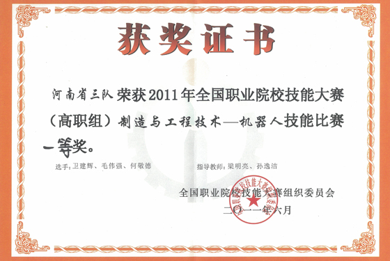 6月26日下午,2011年全国职业院校技能大赛在天津隆重闭幕。我院学生无线电协会会员电子08A1何敬德、电子08A1毛伟强,机车08A2卫建辉参加“机器人应用技术”赛项全国总决赛,并荣获全国一等奖。这是我院继09年全国职业院校技能大赛获得全国一等奖之后,再次获得此类比赛全国一等奖,同时这也是今年我省参加本赛项的三支队伍中,取得的最好成绩的一支队伍。