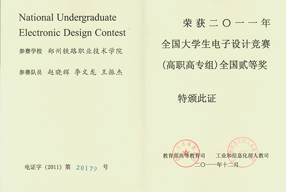 在河南赛区选拔中,协会代表我院组建了14支代表队参加河南赛区的比赛全部获奖,其中获河南省一等奖7个、二等奖5个,三等奖2个。其中有2支参赛队作品入围晋级全国总决赛。9月24日,经过全国组委会的评审,由协会会员工程机械09A1张震、电机电器09A1邢海涛、铁道车辆10A1苗山青组成的参赛队前往天津参加全国一等奖候选队的复测。经过现场测试、专家答辩等环节,最终获得了全国一等奖优异成绩。这也是协会继2007、2009之后在全国大学生电子设计竞赛中再获国家级大奖,其中2007年获得全国大学生电子设计竞赛中最高奖“索尼杯”。