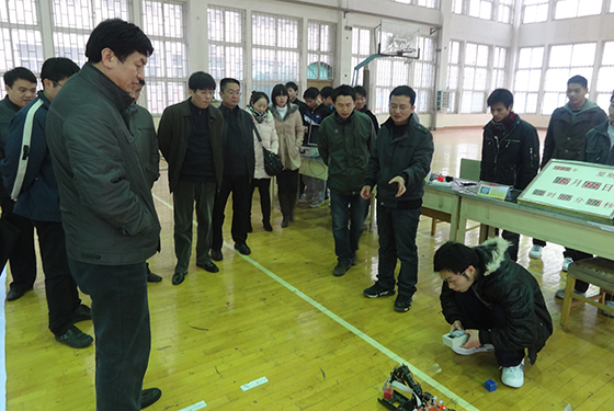 3日下午,团委书记郭志戎,尹良、王晓靖等老师到体育馆参观作品展,并了解这次活动的进展情况。在协会指导老师王云飞的陪同下,郭书记、尹老师、王老师对展出的作品进行了深入的了解并观看了机器人等项目的精彩表演。
